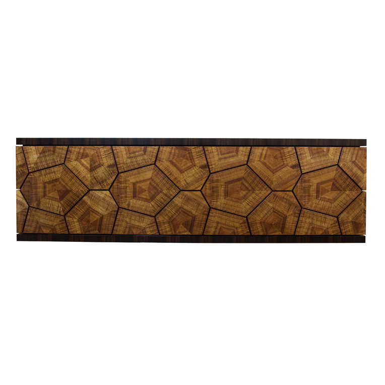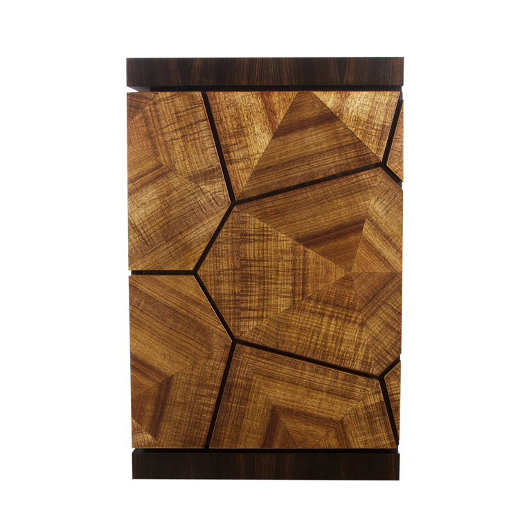 This feature cabinet is made from stunning Tasmanian Fiddleback Blackwood, which is cut into a segmented geometric pattern and is contrasted by black Macassar Ebony.  The inspiration for this design came to Anton Gerner when he saw a tortoise shell at the Tokyo Aquarium. Many of the geometric shapes have push to open drawers behind them.